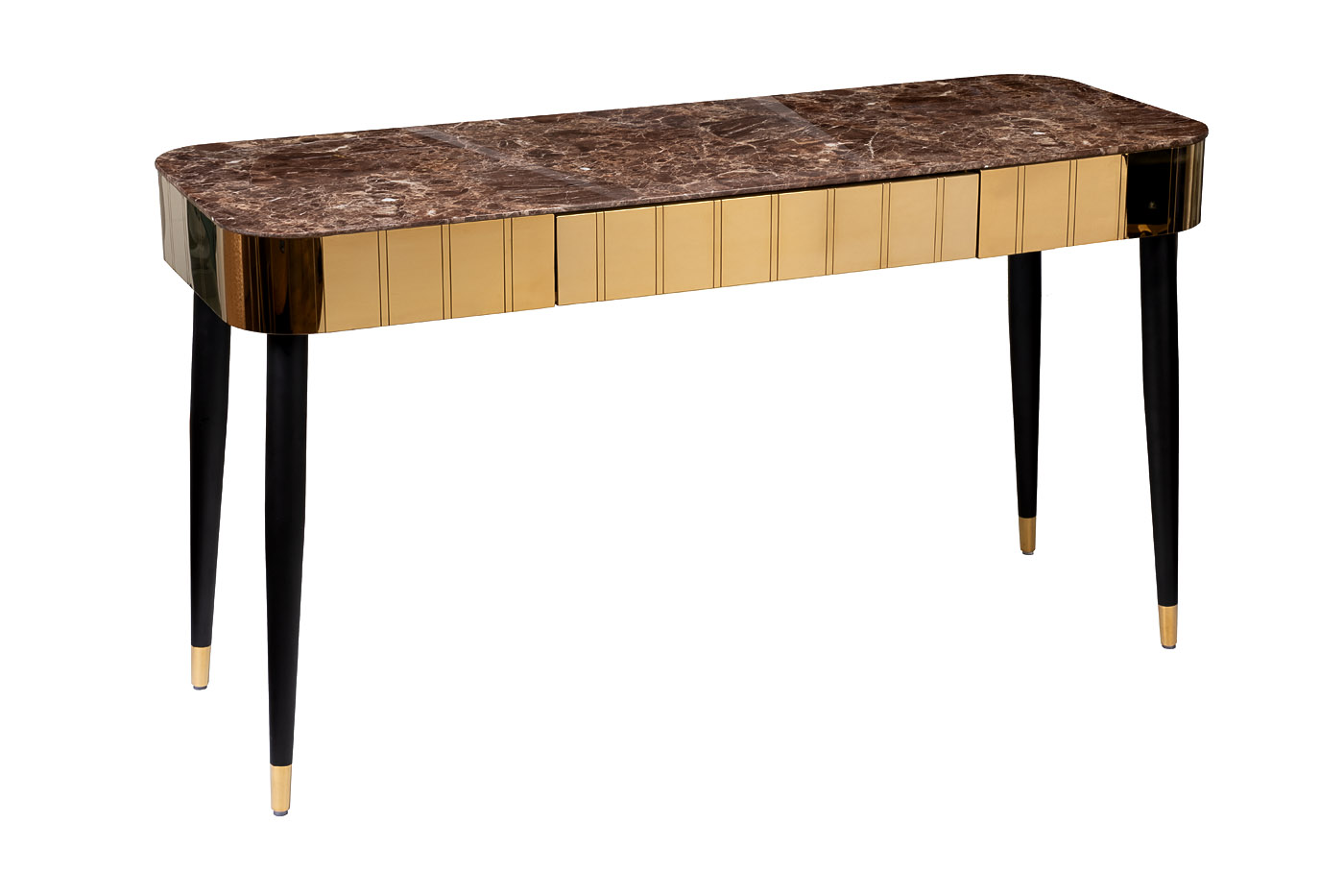 Дизайнерский письменный стол поможет не просто организовать удобное и функциональное рабочее место, но и задать тон всему интерьеру кабинета или гостиной. Сочетание позолоченной нержавеющей стали и столешницы под мрамор выглядит дорого и аристократично, и при этом обеспечивает долгий срок службы мебели. Если вы ищите нестандартный письменный стол для кабинета, эта модель будет отличным выбором. Контрастные черные ножки с небольшими «золотыми» наконечниками придают конструкции легкости, а фактура камня подчеркивает элегантность мебели. У нас вы можете купить письменный стол под мрамор, а также выбрать к нему стул для создания стильного рабочего пространства.