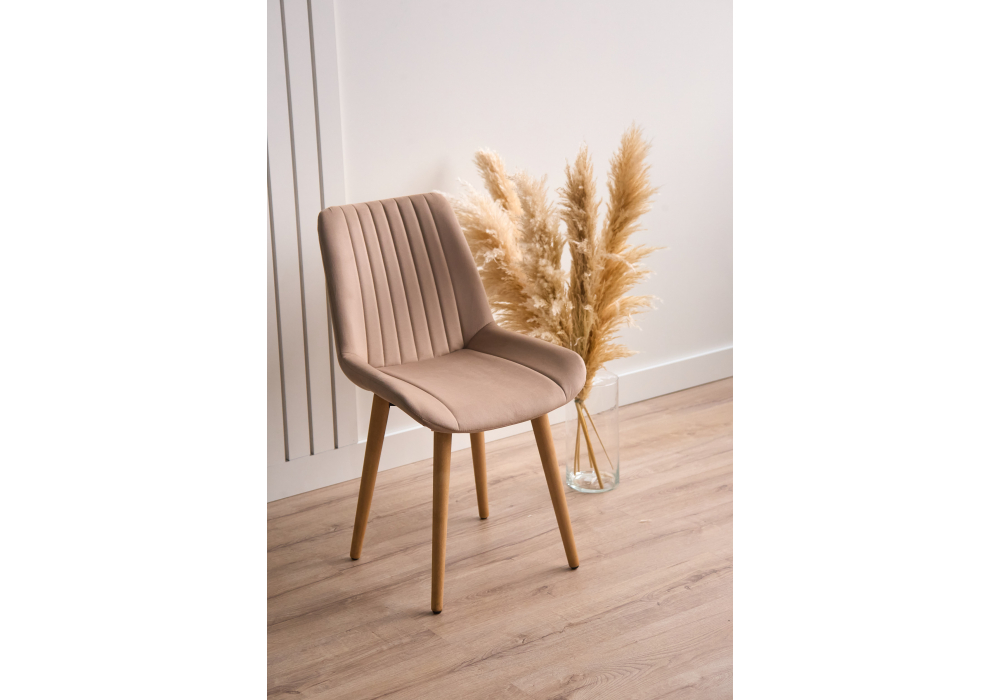Материал каркаса - дерево; Материал сиденья - велюр; Материал обивки - велюр; Цвет ножек - натуральный; Ширина - 50; Глубина - 56; Высота - 82; Ширина сиденья - 47; Глубина сиденья - 42; Высота сиденья - 48;
