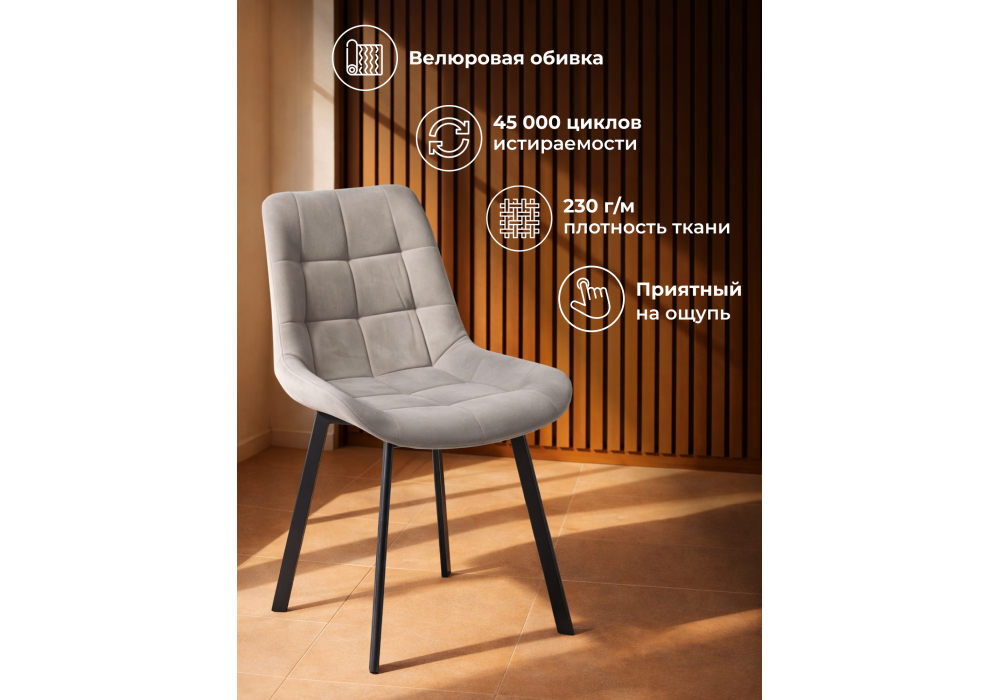 Материал каркаса - металл; Материал сиденья - велюр; Материал обивки - велюр; Цвет ножек - черный; Ширина - 50; Глубина - 60; Высота - 80; Ширина сиденья - 44; Глубина сиденья - 41; Высота сиденья - 48;