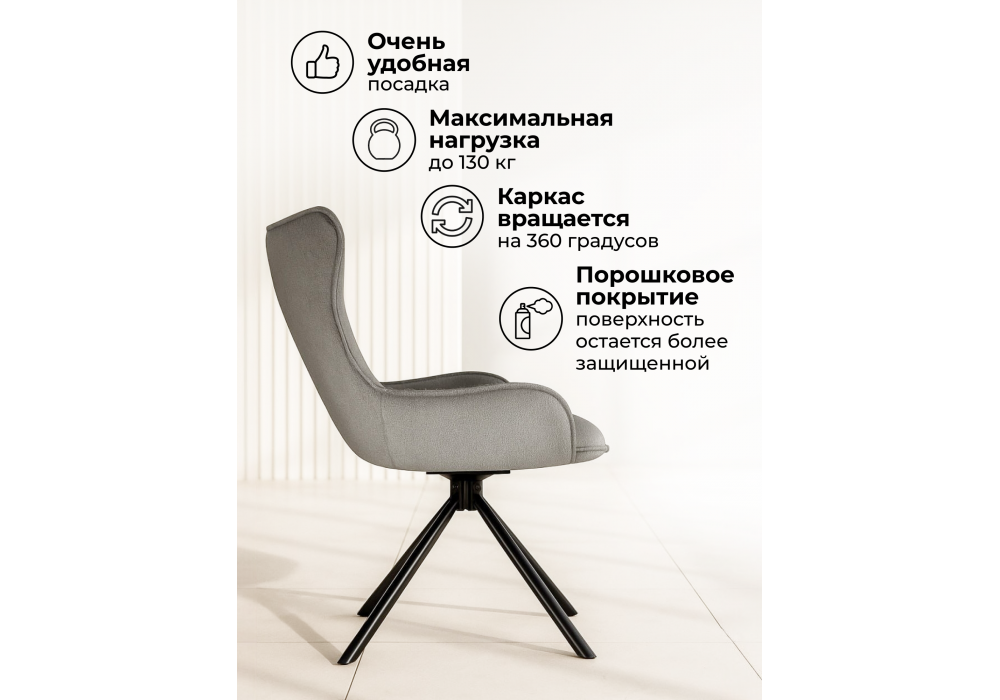 Материал каркаса - металл; Материал сиденья - букле; Материал обивки - букле; Цвет ножек - черный; Ширина - 55; Глубина - 55; Высота - 87; Ширина сиденья - 43; Глубина сиденья - 45; Высота сиденья - 50;