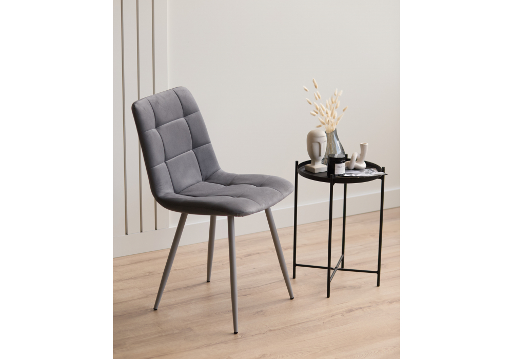 Материал каркаса - металл; Материал сиденья - велюр; Материал обивки - велюр; Цвет ножек - серый; Ширина - 43,5; Глубина - 50; Высота - 87,5; Ширина сиденья - 40; Глубина сиденья - 37,5; Высота сиденья - 49;