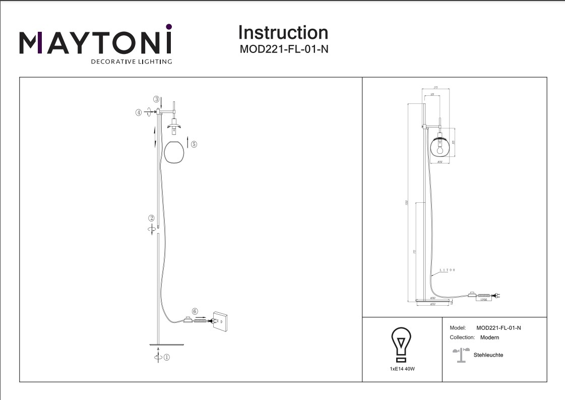 Торшер Maytoni Erich MOD221-FL-01-N, входящая в коллекцию Erich, отлично подойдет для освещения пространства в гостиной, в спальне, на даче, в кабинете, оформленных в современном стиле или в стиле Хай-тек. Данный артикул имеет один плафон диаметром 15 см белого цвета в форме шара, выполненного из стекла и направленного вниз, а также матовую никелированную арматуру, при этом высота светильника равна 155 см. Немецкий производитель Maytoni дает гарантию на свое изделие 2 года и рекомендует использовать для устройства энергосберегающие лампы или лампы накаливания с цоколем Е14 и мощностью 40 Вт, что позволяет осветить помещение площадью 2 кв. м. Технической особенностью этого напольного светильника является наличие выключателя на шнуре. Стильный дизайн и матовая поверхность плафона и арматуры торшера Maytoni Erich MOD221-FL-01-N делают его особенным элементом декора, который украсит любое интерьерное пространство.