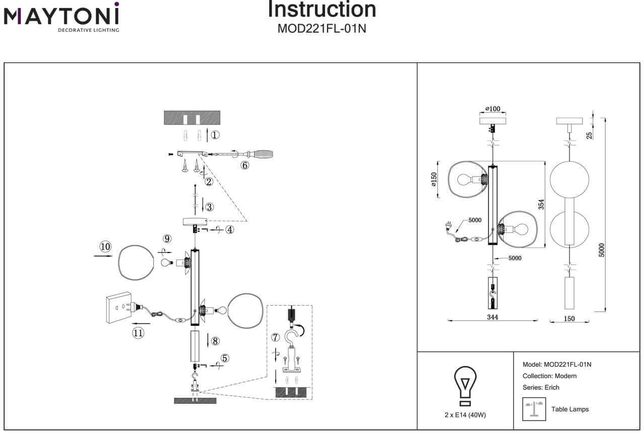 В светильнике 2 плафонов, производитель советует применять лампочки накаливания с цоколем E14 и мощностью 40W. Площадь освещения - кв. м.