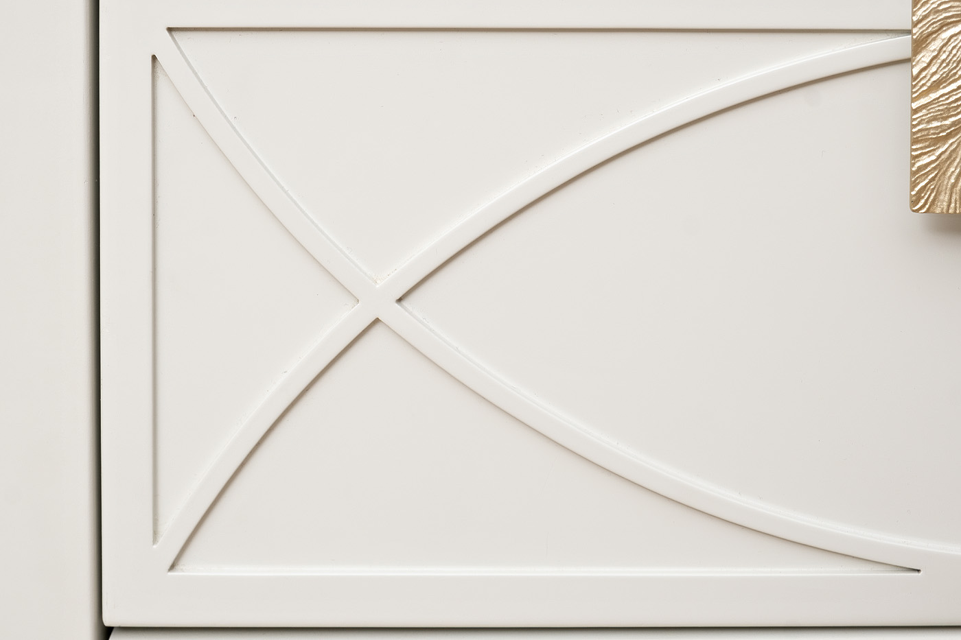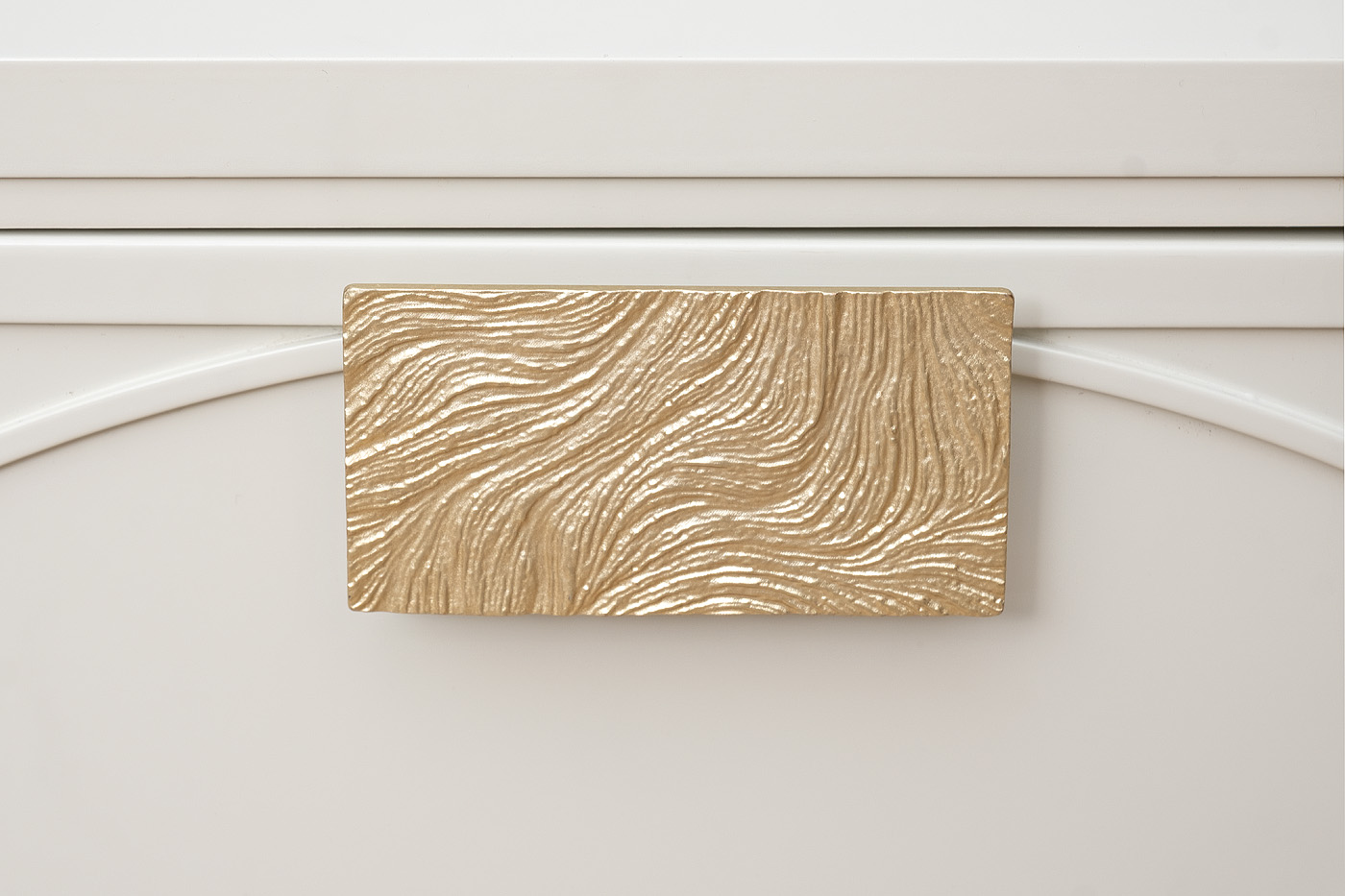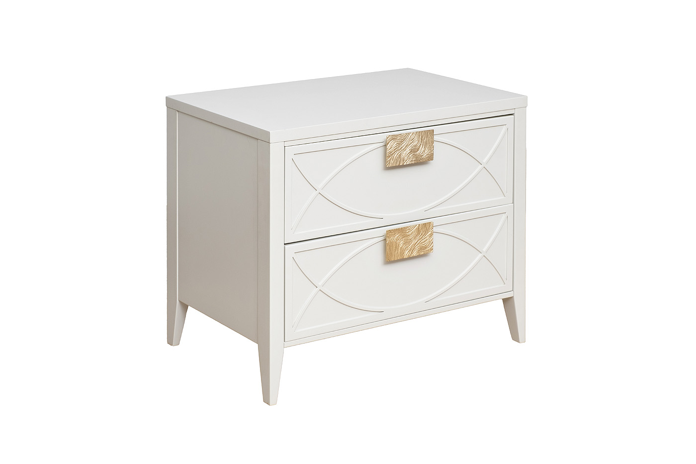 Дизайнерская тумбочка в стиле ар-деко - авторская разработка студии Garda Decor. Бежевый матовый фасад украшен объемным дугообразным декором и широкими рельефными ручками золотого цвета (матовое золото). Два выдвижных ящика прекрасно подойдут для домашней аптечки, хранения белья, щеток, косметики и прочих мелочей. На просторной столешнице будет прекрасно выглядеть одна из настольных ламп в стилистике ар-деко, ассортимент которых широко представлен на нашем сайте. Тонкие ножки придают конструкции легкость и изящество. Эксклюзивная тумбочка станет гармоничным дополнением интерьера спальни, гостиной или прихожей.