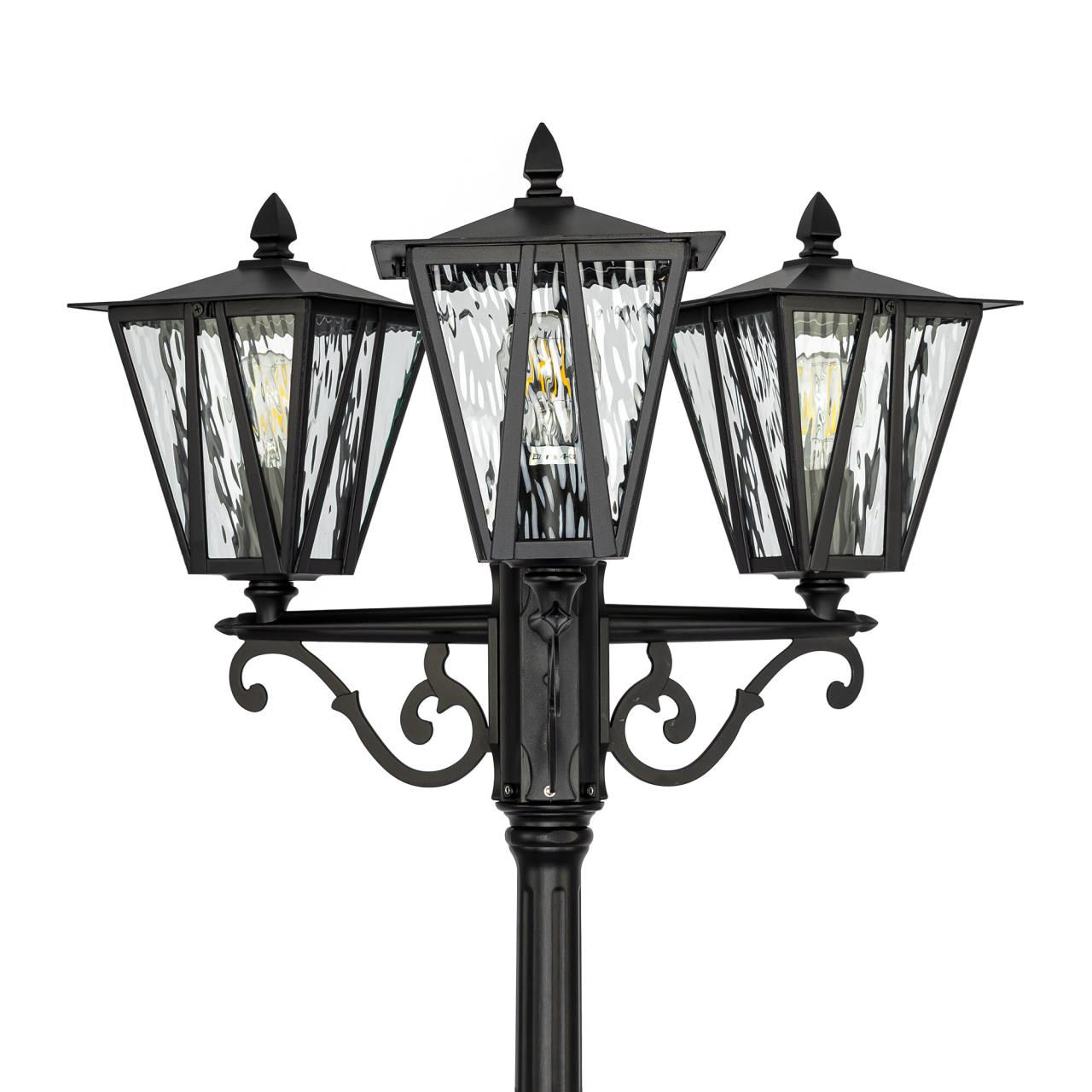 В изделии используются 3 лампы с цоколем Е27, максимальной мощностью для ламп накаливания 40Вт. Рекомендуем устанавливать светодиодные прозрачные филаментные лампы. Наземный светильник с закрытыми плафонами имеет высокую степень защиты — IP54