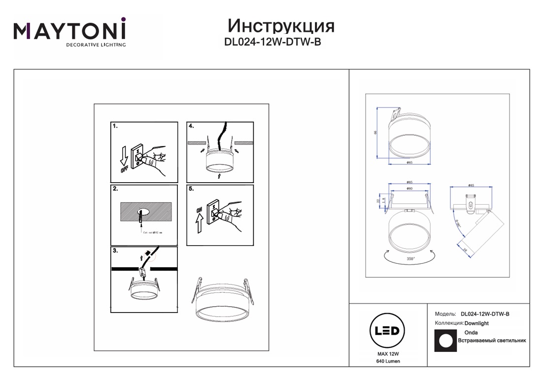 Встраиваемый светодиодный светильник Maytoni Onda DL024-12W-DTW-B — это надёжный и долговечный осветительный прибор, который прослужит вам долгие годы, не теряя своей яркости и качества света.